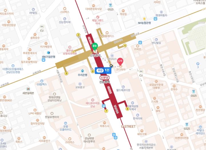 서울 강남구 역삼동에 위치한 클라이밍파크 신논현점은 신논현역 5번 출구에서 나오면 바로 있습니다.