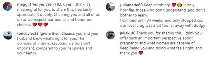 “나는 길을 걷는 것보다 클라이밍을 하는 것이 더 안전합니다. 내 몸은 내가 제일 잘 압니다. 난 선수시절부터 쭉 SNS에 나의 모습을 공유해왔고, 임신했다고 달라지지 않는다” 라고 말했습니다.