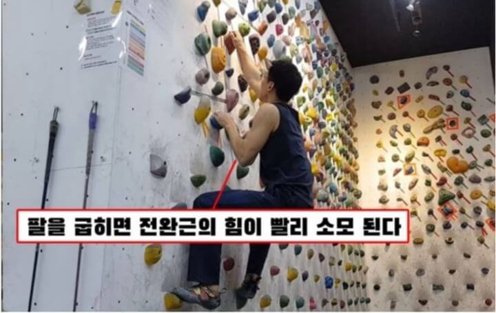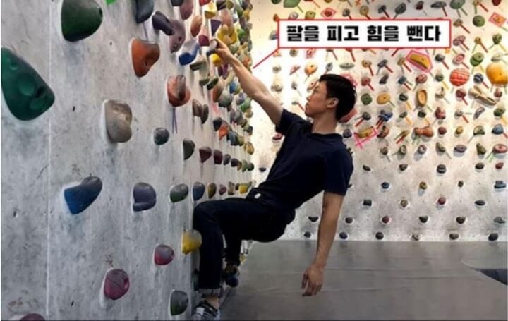 팔을 굽히면 전완근의 힘이 지나치게 많이 소모되고, 몸의 균형을 유지하기 어려워 안정적인 동작을 취하기 어렵습니다. 처음 클라이밍을 하면 떨어질까 무서워 팔을 많이 굽히는데 의식적으로 팔을 굽히지 않도록 주의합니다.