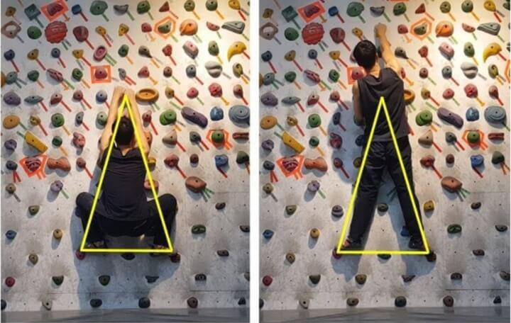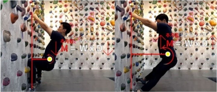 홀드를 잡으면 허리를 벽에 붙여주어 추가 힘(모멘트)이 발생하지 않도록 합니다. 팔에 가해지는 힘은 벽과의 거리 x 몸의 무게 공식에 따라 벽과 가까울수록 힘을 아낄 수 있고 벽에서 멀어지면 힘이 많이 소모됩니다.