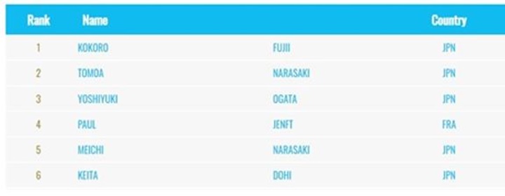 유일한 비일본인 결승 진출자인 프랑스의 Paul Jenft는 2개의 탑과 4개의 존으로 4위에 올랐고, 일본의 토모아 나라사키의 동생인 메이치 나라사키 선수가 5위 케이타 도히 선수가 6위를 차지했습니다.
