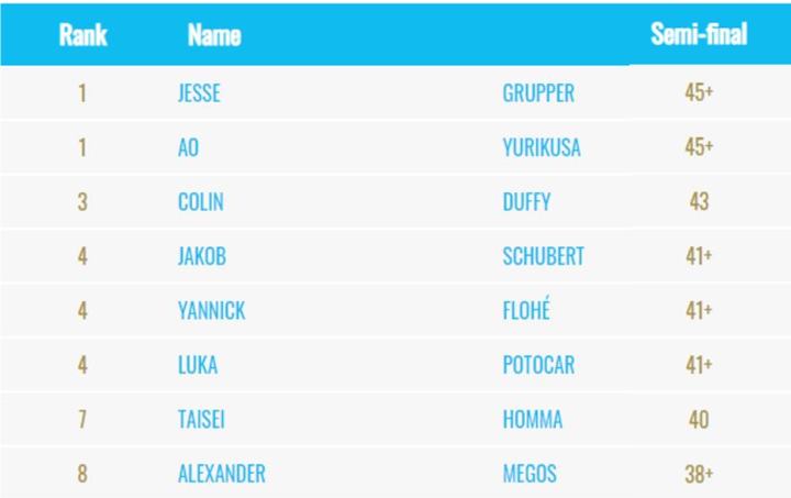 미국의 제시 그루퍼 선수와 일본의 유리쿠사 아오 선수가 45+ 홀드를 기록하며 공동 1위로 결승전에 진출했습니다.