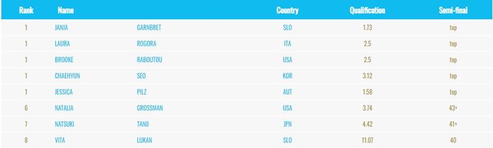 일본의 나쓰키 타니 선수가 41+로 7위, 슬로베니아의 비타 루칸 선수가 40으로 마지막 결승전 티켓을 따냈습니다.